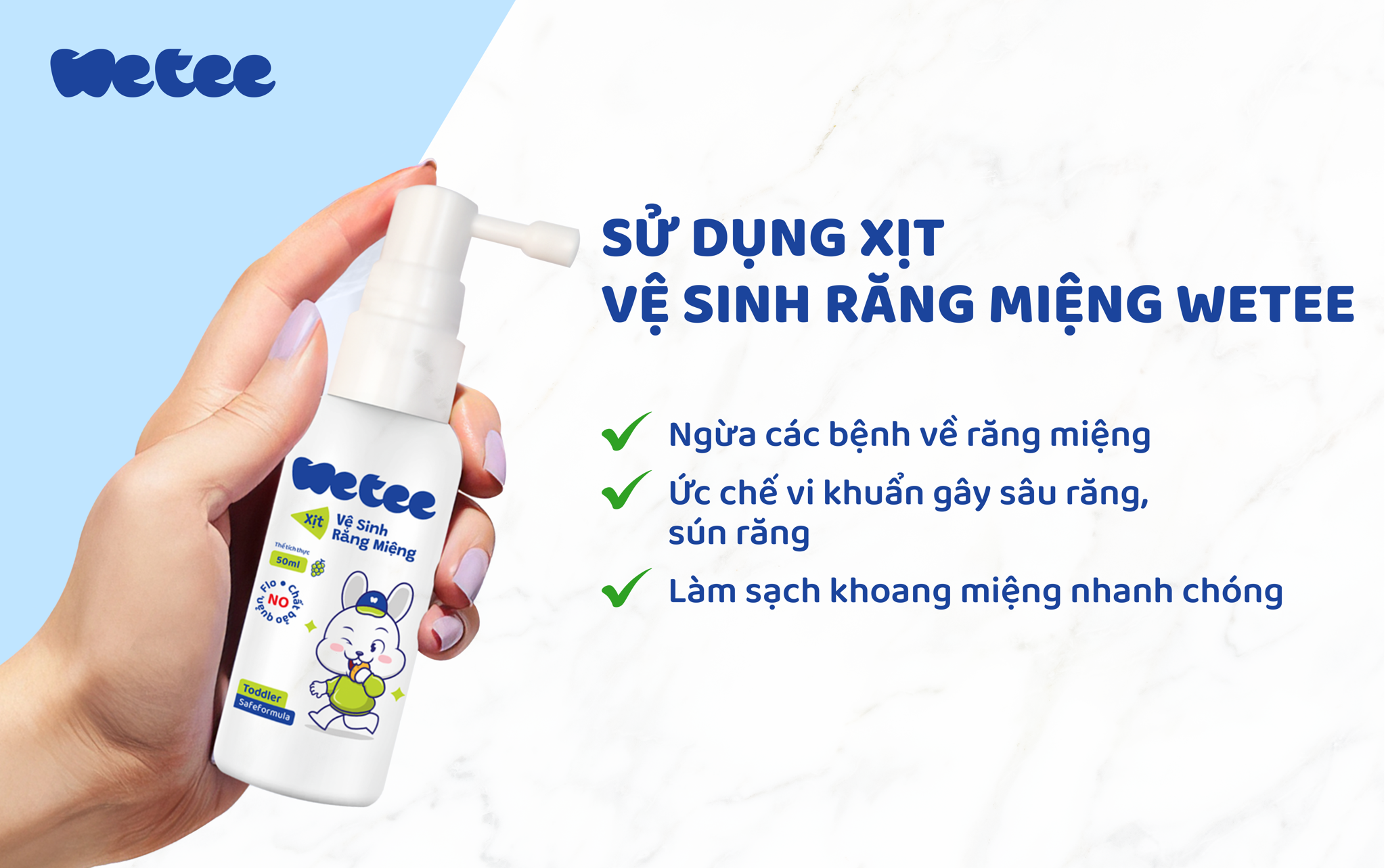 - Dễ dàng sử dụng: Xịt vệ sinh răng miệng Wetee được thiết kế nhỏ gọn, tiện lợi, phù hợp cho cả những bé chưa quen với việc đánh răng.